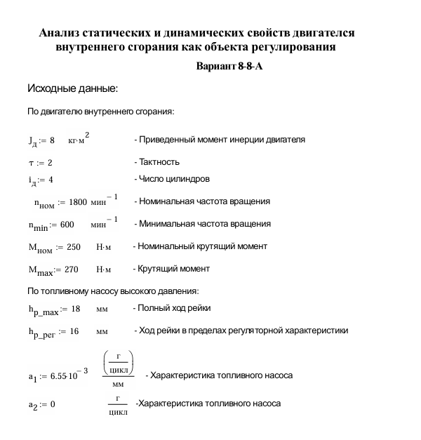 Главная » Учебные материалы » Управление техническими системами (УТС) » Домашние задания » МГТУ им. Н.Э.Баумана » 6 семестр » Номер 1 » Вариант 8-8-А » Анализ статических и динамических свойств двигателя внутреннего сгорания как объекта регулирования