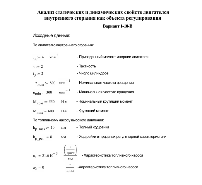 ДЗ 1: Анализ статических и динамических свойств двигателя внутреннего сгорания как объекта регулирования вариант 1-10-В