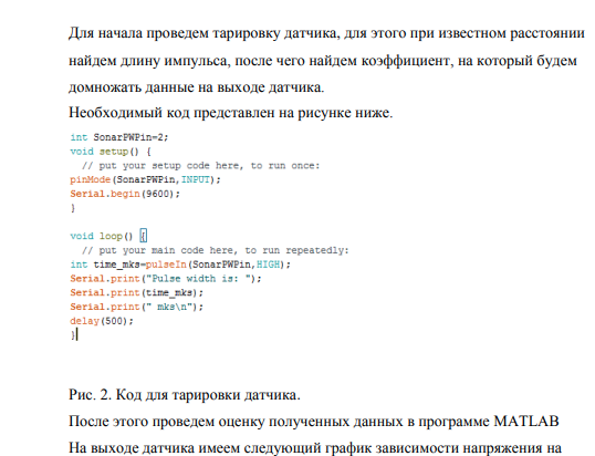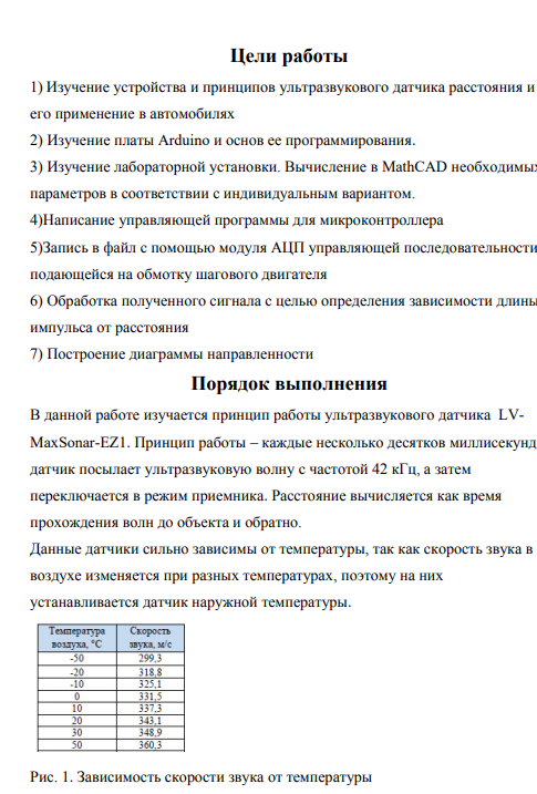 Цели работы 1) Изучение устройства и принципов ультразвукового датчика расстояния и его применение в автомобилях 2) Изучение платы Arduino и основ ее программирования. 3) Изучение лабораторной установки. Вычисление в MathCAD необходимых параметров в соответствии с индивидуальным вариантом. 4)Написание управляющей программы для микроконтроллера 5)Запись в файл с помощью модуля АЦП управляющей последовательности, подающейся на обмотку шагового двигателя 6) Обработка полученного сигнала с целью определения зависимости длины импульса от расстояния 7) Построение диаграммы направленности