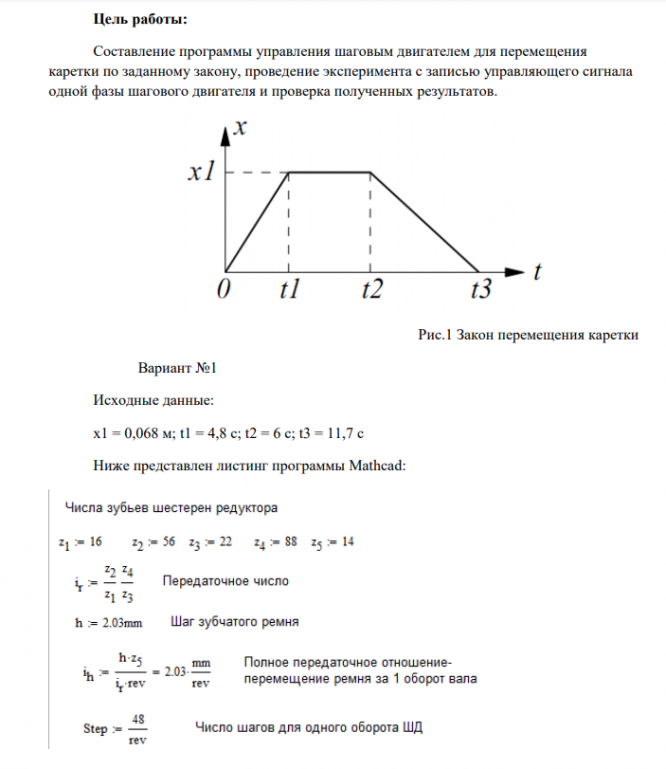 Цель работы: Cоставление программы управления шаговым двигателем для перемещения каретки по заданному закону, проведение эксперимента с записью управляющего сигнала одной фазы шагового двигателя и проверка полученных результатов.