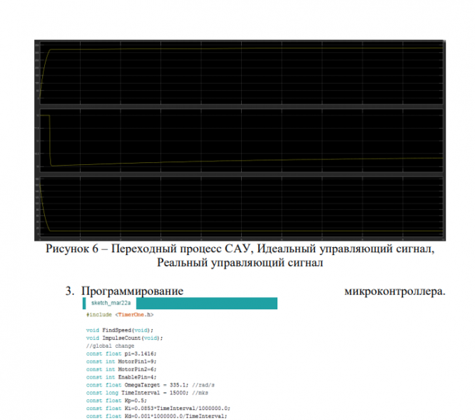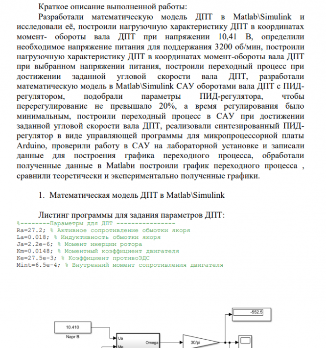 Разработали математическую модель ДПТ в MatlabSimulink и исследовали её, построили нагрузочную характеристику ДПТ в координатах момент- обороты вала ДПТ при напряжении 10,41 В, определили необходимое напряжение питания для поддержания 3200 об/мин, построили нагрузочную характеристику ДПТ в координатах момент-обороты вала ДПТ при выбранном напряжении питания, построили переходный процесс при достижении заданной угловой скорости вала ДПТ, разработали математическую модель в MatlabSimulink САУ оборотами вала ДПТ с ПИДрегулятором, подобрали параметры ПИД-регулятора, чтобы перерегулирование не превышало 20%, а время регулирования было минимальным, построили переходный процесс в САУ при достижении заданной угловой скорости вала ДПТ, реализовали синтезированный ПИДрегулятор в виде управляющей программы для микропроцессорной платы Arduino, проверили работу в САУ на лабораторной установке и записали данные для построения графика переходного процесса, обработали полученные данные в Matlabи построили график переходного процесса , сравнили теоретически и экспериментально полученные графики.