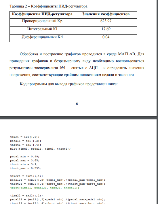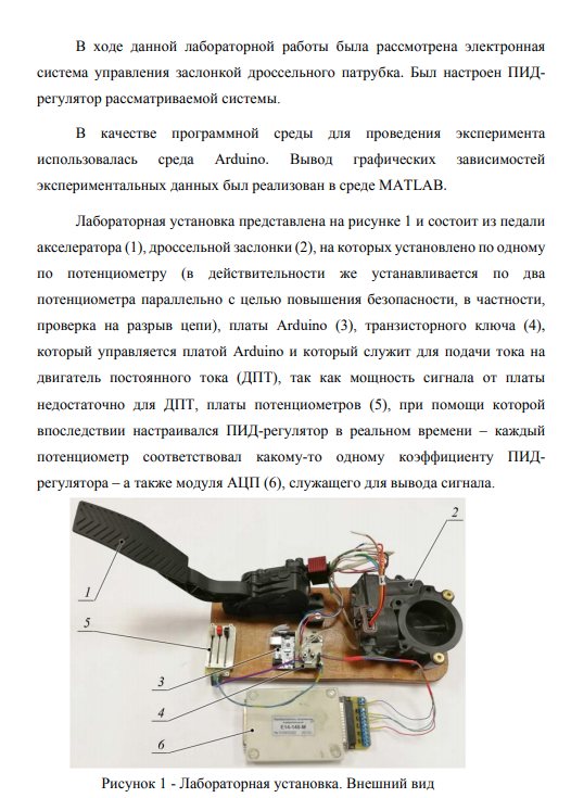 В ходе данной лабораторной работы была рассмотрена электронная система управления заслонкой дроссельного патрубка. Был настроен ПИДрегулятор рассматриваемой системы. В качестве программной среды для проведения эксперимента использовалась среда Arduino. Вывод графических зависимостей экспериментальных данных был реализован в среде MATLAB.