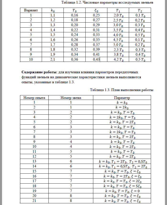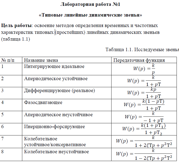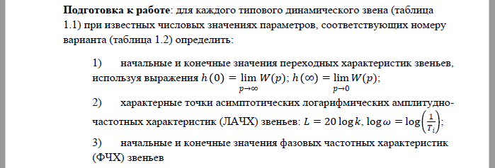 Показать/скрыть дополнительное описаниеЛабораторная работа №1: Типовые линейные динамические звенья; Цель работы: освоение методов определения временных и частотных характеристик типовых (простейших) линейных динамических звеньев Для каждого типового динамического звена 1.1) при известных числовых значениях параметров, соответствующих номеру варианта определить: 1) начальные и конечные значения переходных характеристик звеньев, используя выражения 2) характерные точки асимптотических логарифмических амплитудно-частотных характеристик (ЛАЧХ) звеньев: 3) начальные и конечные значения фазовых частотных характеристик (ФЧХ) звеньев.