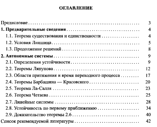 8 9 9 12 2.3. Области притяжения и время переходного процесса. 2.4. Теоремы Барбашина - Красовского. 17 20 2.5. Теорема Ла-Салля 23 2.6. Теорема Четаева. 2.7. Линейные системы 25 28 2.8. Устойчивость по первому приближению. 34 2.9. Доказательство теоремы 2.6.. Список рекомендуемой литературы. 40 42      .