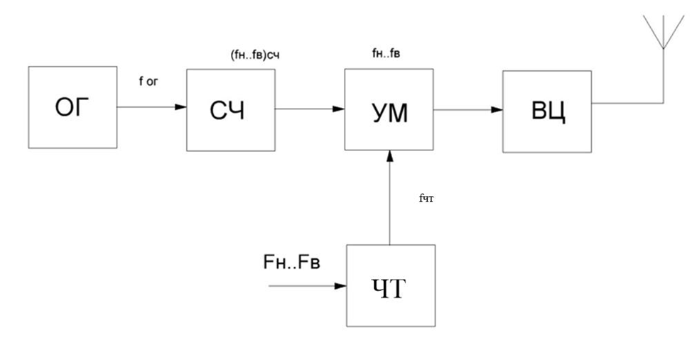 В данной структурной схеме формирование сигналов (модуляция) осуществляется в оконечном или предоконечном каскаде усиления мощности.Мощность сигнала на выходе возбудителя Pвозб составляет 10-50 мВт. Информационный сигнал задается в виде сигнала НЧ – Fн..Fв.