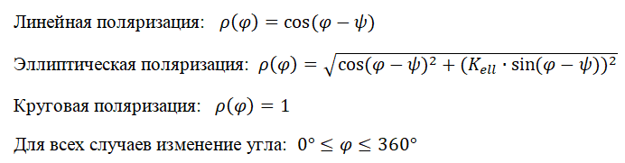 Угол наклона большой оси поляризационного эллипса к горизонту Ψ= 40° ; Коэффициент эллиптичности Кell = 0.3.Построим поляризационные диаграммы для линейной, эллиптической и круговой поляризации. Рассчитанные дома зависимости совместим с экспериментальными данными, полученными в лаборатории.