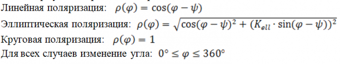 Угол наклона большой оси поляризационного эллипса к горизонту Ψ= 48° ; Коэффициент эллиптичности Кell = 0.25.