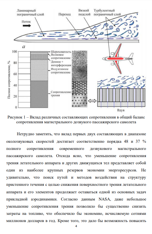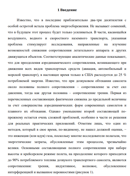 Известно, что в последние приблизительно два-три десятилетия с особой остротой встала проблема энергосбережения. Не вызывает сомнений, что в будущем этот процесс будет только усиливаться. В части, касающейся воздушного, водного и скоростного наземного транспорта, указанная проблема стимулирует исследования, направленные на изучение возможностей снижения сопротивления летательного аппарата и других движущихся объектов. Соответствующие аналитические данные показывают, что для преодоления аэродинамического сопротивления, возникающего при движении всех видов транспортных средств (авиация, автомобильный и морской транспорт), в настоящее время только в США расходуется до 25 % потребляемой энергии. Известно, что при дозвуковом обтекании самолета около половины полного сопротивления – сопротивление за счет сил давления, тогда как другая половина – сопротивление трения. Первая из перечисленных составляющих фактически снижена до предельной величины за счет совершенства аэродинамических форм современных самолетов и плавного их обтекания. Однако уменьшение второй составляющей попрежнему остается очень сложной проблемой, особенно в части ее решения для реальных практических приложений. Отметим лишь, что один из методов, который в свое время, по-видимому, не нашел должной оценки, − это инжекция (или вдув) газа, поскольку многие исследователи полагали, что энергетические затраты, обусловленные этим процессом, чрезвычайно велики. Основными составляющими полного сопротивления при наборе высоты и крейсерском режиме полета, на преодоление которого приходится до 90% потребляемого топлива дозвукого транспортного самолета, являются сопротивления: трения, индуктивное, волновое, обусловленное интерференцией и вызванное неровностями (рисунок 1).