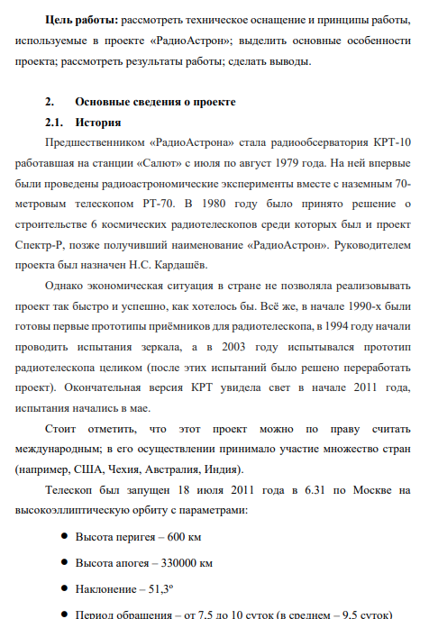 Цель работы: рассмотреть техническое оснащение и принципы работы, используемые в проекте «РадиоАстрон»; выделить основные особенности проекта; рассмотреть результаты работы; сделать выводы.