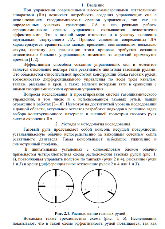 При управлении современными высокоманевренными летательными аппаратами (ЛА) возникает потребность создания управляющих сил с использованием газодинамических органов управления, так как на определенных участках траектории ЛА и его режимах работы аэродинамические органы управления оказываются недостаточно эффективными. Это в полной мере относится и к участку склонения вертикально стартующего ЛА. Процесс склонения современных ЛА характеризуется сравнительно малым временем, составляющим несколько секунд, поэтому для реализации этого процесса требуется создание относительно больших управляющих моментов за короткий промежуток времени [1, 2]. Эффективным способом создания управляющих сил и моментов является отклонение вектора тяги реактивного двигателя газовыми рулями. Это объясняется относительной простотой конструкции блока газовых рулей, возможностью дифференциального управления по всем трем каналам: тангаж, рысканье и крен, а также малыми потерями тяги в сравнении с иными газодинамическими органами управления. Вопросы исследования и проектирования систем газодинамического управления, в том числе и с использованием газовых рулей, нашли отражение в работах [3–10]. Несмотря на достигнутый уровень исследований в данной области, актуальной остается разработка подходов к решению задач выбора конструкционного материала и внешней геометрии газового руля систем склонения ЛА.