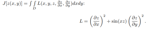 ДЗ по вариационному исчислению 3 курс 6 семестр СМ группа СМ7-63Б. Сдано Котовичу Вариант 7 1. Найти все экстремали функционала J[y], удовлетворяющего граничным условиям 2. Исследовать на экстремум функционал 3. Найти функции y1, y2 C1(x1, x2), на кото ых может достигаться кст емум функционала J[y1, y2]. 4. Найти экстремали функционала J[y] = s{x1, x2} L (x, y, y\', y\'\')dx 5. Выписать необходимые условия экстремума функционала 6. Найти экстремали функционала в задаче с подвижными границами 7. Методом множителей Лагранжа найти экстремали функционала в задаче на условный экстремум 8. Найти функции, на которых может достигаться экстремум в изопериметрической задаче 9.