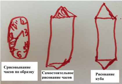 При объективном обследовании врачом-неврологом установлен легкий регрессирующий гемипарез справа, моторная афазия. При нейропсихологическом обследовании продуктивный вербальный контакт с пациентом затруднен, в ответах на вопросы пациент «застревает» на одном произнесенном ранее слове, произносит его как ответ на последующие вопросы. Письмо и чтение крайне затруднены, на письме многочисленные повторы. Выполнение серий движений невозможно, пациент застревает на одном движении. К своему состоянию критичен, пытается исправлять допущенные ошибки. Образец выполнения пациентом продуктивных заданий приведен на рисунке 3. .