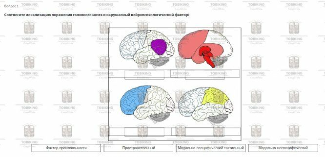 Соотнесите локализацию поражения головного мозга и нарушаемый нейропсихологический фактор: Фактор произвольности Модально-неспецифический Пространственный Модально-специфический Соотнесите функциональные блоки мозга по А.Р. Лурия с их графическим изображением 1 функциональный блок 2 функциональный блок 3 функциональный блок Определите соответствие локализации очагового поражения голоного мозга и характерных для них форм афазии Локализация пораженияФорма афазии Семантическая афазия Афферентная моторная афазия Сенсорная афазия Эфферентная моторная афазия Динамическая афазия Соотнесите функциональные блоки мозга по А.Р. Лурия и их функции: Функциональные блоки мозгаФункции Энергетическое обеспечение работы мозга Прием, переработка и хранение информации, поступающей из внешней среды Регуляция и контроль когнитивной деятельности и поведения Нарушение гнозиса происходит при функциональном поражении затылочных долей головного мозга.