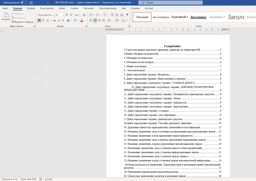 Ответы к контрольной работе по ВАП (2 часть). Для ВУЦ. 10 семестр по следующим вопросам, удобный поиск Содержание: 1 Структура правил дорожного движения, принятых на территории РФ. 3 2Общие обязанности водителей. 4 3. Обязанности пешеходов: 6 4. Обязанности пассажиров: 6 5. Общие положения. 7 6. "Автомагистраль". 7 7. Дайте определение термину «Водитель». 8 8. Дайте определение термину «Вынужденная остановка». 8 9. Дайте определение следующему термину: ГЛАВНАЯ ДОРОГА. 8 10. Дайте определение следующему термину: дОРОЖНО-ТРАНСПОРТНОЕ ПРОИСШЕСТВИЕ. 8 11. Дайте определение следующему термину: Механическое транспортное средство- 9 12. Дайте определение следующему термину: Обгон- 9 13.