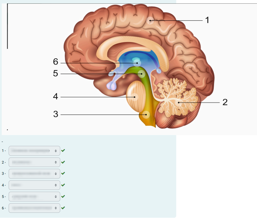 Рассмотрите топографию отделов головного мозга. Установите соответствие названия отделу мозга путем сопоставления цифры и названия.