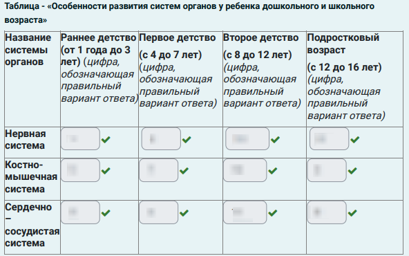 Ежегодный прирост веса ребенка составляет 2–2,5 кг в год, роста 4–5 см. Выявляются половые различия в размерах и форме тела. Задание 5 Охрана здоровья детей и молодежи регулируется санитарно-эпидемиологическими требованиями к организациям воспитания и обучения, утвержденными Постановлением Главного государственного санитарного врача РФ от 28.09.2020 №28. Выберите и распределите требования на две группы: к помещениям образовательной организации и требования к организации образовательного процесса и режима дня. Для этого впишите в соответствующую ячейку таблицы цифры, которыми обозначены правильные варианты ответов. Цифры необходимо вписать по порядку следования чисел, без запятых и пробелов.