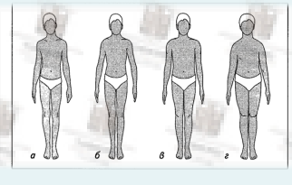 Эпигастральный угол прямой. Спина с нормально выраженными изгибами, жироотложение умеренное, костный рельеф сглажен. Удлиненные конечности, грудная клетка удлиненная, плоская, суженная книзу. Эпигастральный угол острый. Спина сутулая с резко выступающими лопатками, живот прямой. Из-за слабо выраженного подкожно-жирового слоя хорошо виден рельеф плечевого пояса и грудной клетки. Значительное развитие грудной клетки. Она имеет цилиндрическую форму, слегка уплощена, эпигастральный угол прямой. Спина нормальная, иногда с выступающими лопатками.   .