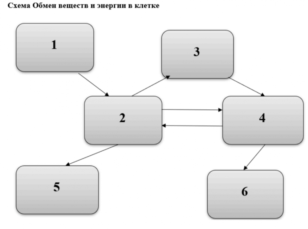 Изучите схему протекания обменных процессов в клетке и выберите из выпадающего списка соответствующие номеру блока в схеме названия этапов метаболизма. Обратите внимание, что в числе предлагаемых вариантов ответов имеются неверные (фальшответы).