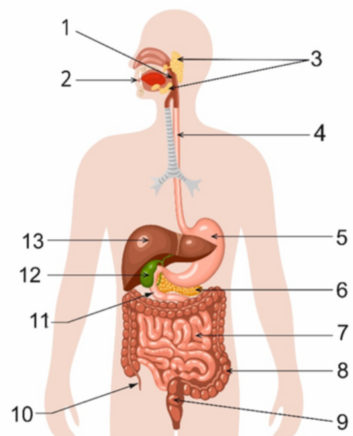 Впишите название органов пищеварительной системы в соответствии с цифрами на картинке, регистр букв значения не имеет.