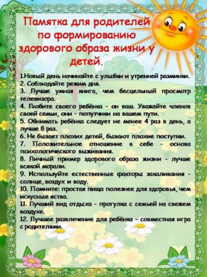 Изучите памятку для родителей по формированию здорового образа жизни у детей. Впишите правильные ответы, указав цифры без пробелов и запятых, обозначающие соответствующий пункт в памятке, в котором отражается формирование здорового образа жизни у детей.