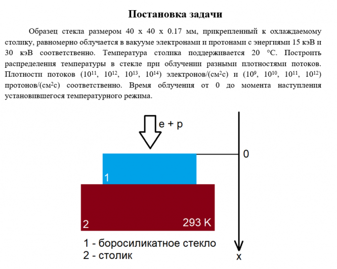 Для студентов МГТУ им. Н.Э.Баумана по предмету Вычислительная физикаМоделирование температурного распределения в боросиликатном стекле при облучение электронами и протонами с разными плотностями потоковМоделирование температурного распределения в боросиликатном стекле при облучение электронами и протонами с разными плотностями потоков