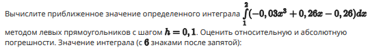 Вычислите приближенное значение определенного интеграла методом левых прямоугольников с шагом . Оценить относительную и абсолютную погрешности. Значение интеграла (с знаками после запятой):