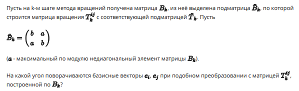 Пусть на k-м шаге метода вращений получена матрица , из неё выделена подматрица , по которой строится матрица вращения с соответствующей подматрицей . Пусть ( - максимальный по модулю недиагональный элемент матрицы ). На какой угол поворачиваются базисные векторы , при подобном преобразовании с матрицей , построенной по