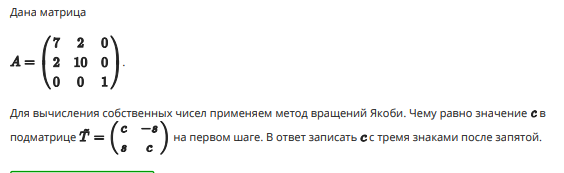Дана матрица . Для вычисления собственных чисел применяем метод вращений Якоби. Чему равно значение в подматрице на первом шаге. В ответ записать c тремя знаками после запятой