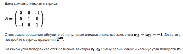 Дана симметрическая матрица . С помощью вращения обнулите её ненулевые внедиагональные элементы . Для этого постройте матрицу вращения . На какой угол поворачиваются базисные векторы , ? Чему равны синус и косинус угла поворота