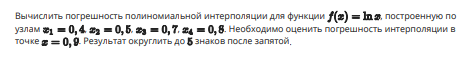 Вычислить погрешность полиномиальной интерполяции для функции , построенную по узлам , , , . Необходимо оценить погрешность интерполяции в точке . Результат округлить до знаков после запятой