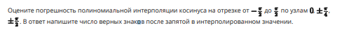 Оцените погрешность полиномиальной интерполяции косинуса на отрезке от до по узлам , , . В ответ напишите число верных знаков после запятой в интерполированном значении