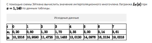 С помощью схемы Эйткена вычислить значение интерполяционного многочлена Лагранжа при по данным таблицы.