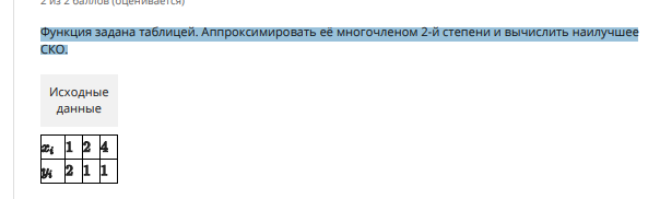 Функция задана таблицей. Аппроксимировать её многочленом 2-й степени и вычислить наилучшее СКО.