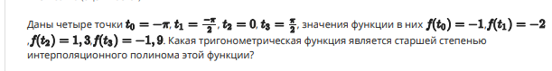 Даны четыре точки , , , , значения функции в них , , , . Какая тригонометрическая функция является старшей степенью интерполяционного полинома этой функции?