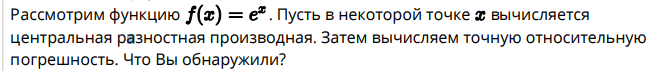 Рассмотрим функцию . Пусть в некоторой точке вычисляется центральная разностная производная. Затем вычисляем точную относительную погрешность. Что Вы обнаружили?