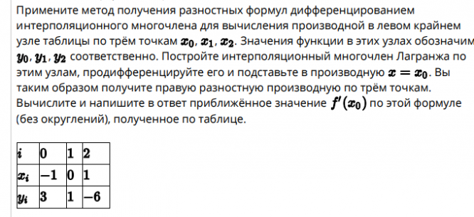 Примените метод получения разностных формул дифференцированием интерполяционного многочлена для вычисления производной в левом крайнем узле таблицы по трём точкам , , . Значения функции в этих узлах обозначим , , соответственно. Постройте интерполяционный многочлен Лагранжа по этим узлам, продифференцируйте его и подставьте в производную . Вы таким образом получите правую разностную производную по трём точкам. Вычислите и напишите в ответ приближённое значение по этой формуле (без округлений), полученное по таблице.