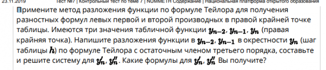 Примените метод разложения функции по формуле Тейлора для получения разностных формул левых первой и второй производных в правой крайней точке таблицы. Имеются три значения табличной функции , , (правая крайняя точка). Напишите разложения функции в , в окрестности (шаг таблицы ) по формуле Тейлора с остаточным членом третьего порядка, составьте и решите систему для , . Какие формулы для , Вы получите?