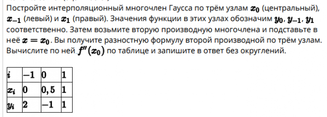 Постройте интерполяционный многочлен Гаусса по трём узлам (центральный), (левый) и (правый). Значения функции в этих узлах обозначим , , соответственно. Затем возьмите вторую производную многочлена и подставьте в неё . Вы получите разностную формулу второй производной по трём узлам. Вычислите по ней по таблице и запишите в ответ без округлений.