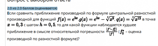Если сравнить приближение производной по формуле центральной разностной производной для функций , , в точке с шагом , то для какой функции наблюдается худшее приближение в смысле относительной погрешности ( – оценка производной по разностной формуле)?