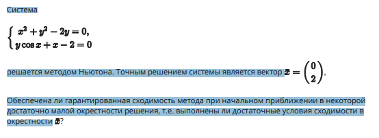 Система решается методом Ньютона. Точным решением системы является вектор . Обеспечена ли гарантированная сходимость метода при начальном приближении в некоторой достаточно малой окрестности решения, т.е. выполнены ли достаточные условия сходимости в окрестности