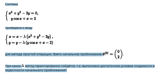Система приведена к виду для метода простой итерации. Взято начальное приближение . При каких метод гарантированно сойдётся, т.е. выполнено достаточное условие сходимости в окрестности начального приближения?