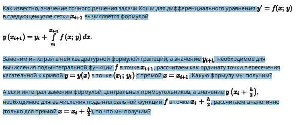 Как известно, значение точного решения задачи Коши для дифференциального уравнения в следующем узле сетки вычисляется формулой . Заменим интеграл в ней квадратурной формулой трапеций, а значение , необходимое для вычисления подынтегральной функции в точке , рассчитаем как ординату точки пересечения касательной к кривой в точке с прямой . Какую формулу мы получим? А если интеграл заменим формулой центральных прямоугольников, а значение , необходимое для вычисления подынтегральной функции в точке , рассчитаем аналогично (только для прямой ), то что мы получим?