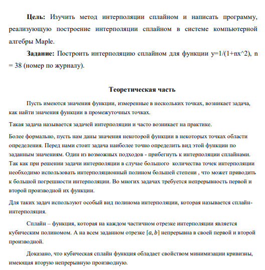 Цель: Изучить метод интерполяции сплайном и написать программу, реализующую построение интерполяции сплайном в системе компьютерной алгебры Maple. Задание: Построить интерполяцию сплайном для функции y=1/(1+nx^2), n = 38 (номер по журналу).