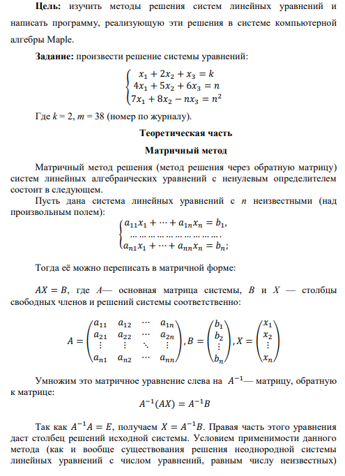 Цель: изучить методы решения систем линейных уравнений и написать программу, реализующую эти решения в системе компьютерной алгебры Maple.