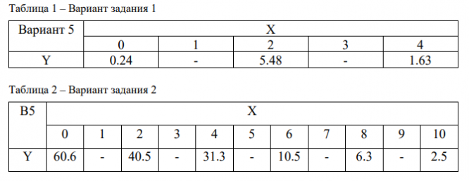 2. В промежутке [0,10] по оси x задано (таблица 2) шесть дискретных значений аргумента и соответствующие им значения функции yi= f(x), где i - номер варианта задания. По исходным данным определить пять промежуточных
