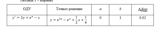 1. Методами Эйлера и сравнить с точным решением. Для каждого метода найти требуемое количество интервалов разбиения промежутка для обеспечения относительной погрешности решения на конце промежутка не более . Для каждого метода проделать вручную первые три шага интегрирования;