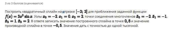Построить квадратичный сплайн на отрезке для приближения заданной функции . Узлы , , , точки соединения многочленов , , , . В ответе записать значение построенного сплайна в точке и значение производной сплайна в точке . Значения дать с точностью до одной тысячной
