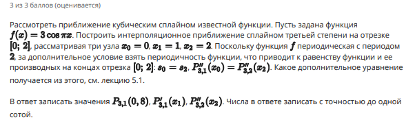 Рассмотреть приближение кубическим сплайном известной функции. Пусть задана функция . Построить интерполяционное приближение сплайном третьей степени на отрезке , рассматривая три узла , , . Поскольку функция периодическая с периодом , за дополнительное условие взять периодичность функции, что приводит к равенству функции и ее производных на концах отрезка : , . Какое дополнительное уравнение получается из этого, см. лекцию 5.1. В ответ записать значения , , . Числа в ответе записать с точностью до одной сотой