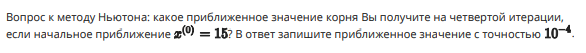 Вопрос к методу Ньютона: какое приближенное значение корня Вы получите на четвертой итерации, если начальное приближение ? В ответ запишите приближенное значение с точностью