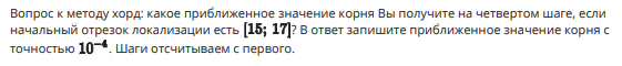Вопрос к методу хорд: какое приближенное значение корня Вы получите на четвертом шаге, если начальный отрезок локализации есть ? В ответ запишите приближенное значение корня с точностью . Шаги отсчитываем с первого